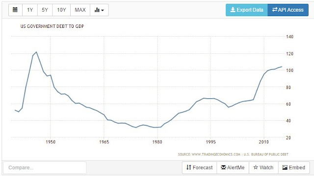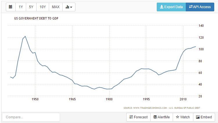 The chart shows US Government debt to GDP. Note the increase starting in 1980. That was the great Reagan who INCREASED the government debt in order to financially outsmart the Soviets with increased defence spending and programmes, such as the Strategic Defence Initiative, a.k.a. Star Wars. Reagans successor, the very good republican president George H.W. Bush had to handle the first Iraqi war, and of course such a campaign costed money and resources. Thus the government debt continued to increase, but for a very good reason.