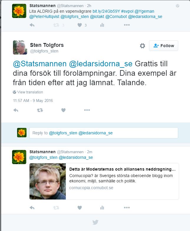 1. Före detta försvarsminister Sten Tolgfors. Vapenvägraren med det berömda smeknamnet ”Tomhylsan”, när han var försvarsminister. För Sten var det inte så viktigt med försvar. För Stens chef, Fredrik hade ju påstått att försvaret var ett ”särintresse”. Plus så klart riksståthållaren Anders, som också tyckte att försvaret kostade alldeles för mycket. Och när man gjorde ”satsningar”, så var dessa kommunikationsbudskap. Dessutom så fortsätter de nya moderaterna med Stens ”satsningar” på försvaret.