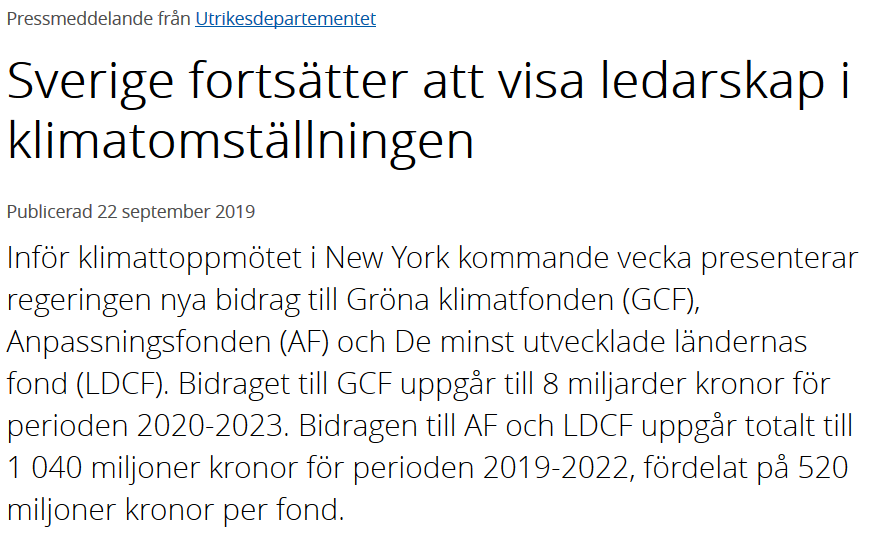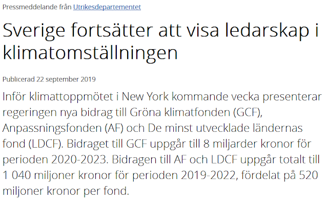 Om regeringen hade gjort rätt, så hade de använt 8 miljarder kronor till att hjälpa till med finansieringen av ett nytt kärnkraftverk, för att följa IPCC:s råd. Eller bygga ut det svenska elnätet, så att vi kan ladda elbilar hemma och vid arbetsplatser. Men nej, här jagar man ännu en gång status inom FN-systemet. Till vilken nytta? Det blir nog som med mycket av våra bistånd, mest korruption och kostsamma menlösa projekt. Men det är klart, ett kärnkraftverk hade aldrig gett jobb inom det gröna bidragsindustriella komplexet, eller för den delen andra politruker som jobbar inom FN.