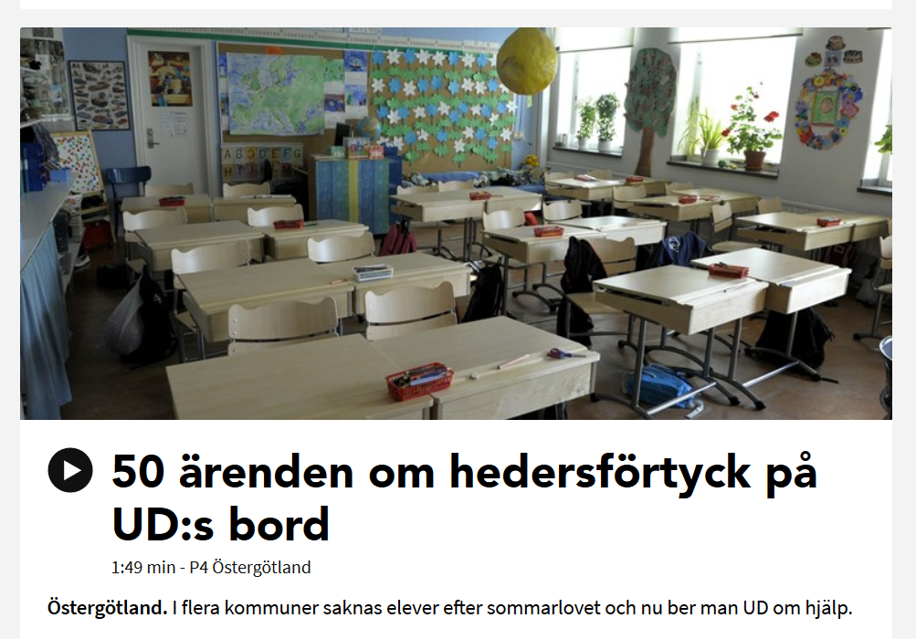 Här rapporterar man om barn som ”försvunnit” från skolan. Det handlar om invandrarbarn, som inte återvänder till sin skola efter ”semester” i hemlandet, där man antingen har tvångsgifts, uppfostrats eller andra hedersrelaterade åtgärder mot barn.