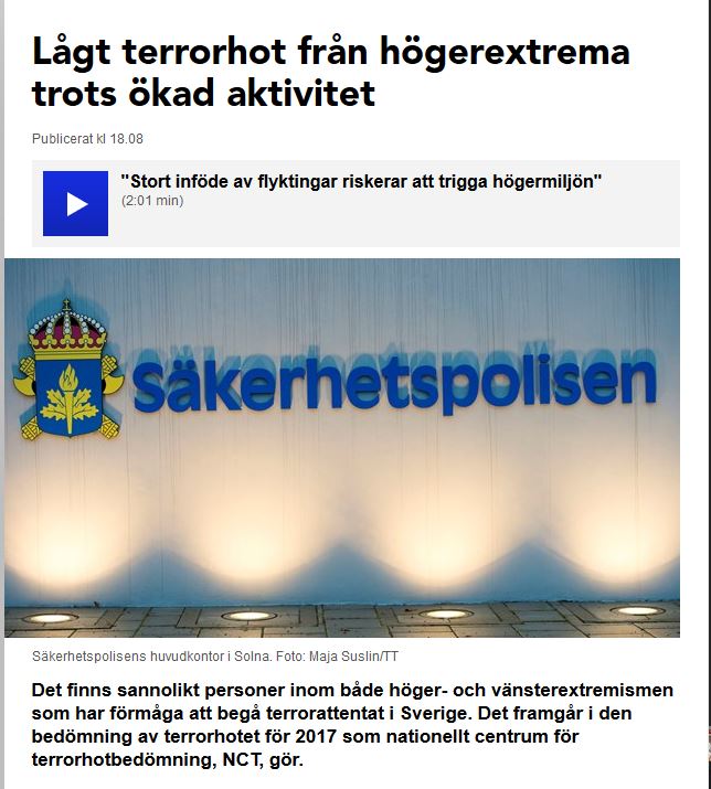 Som ni ser, så är hotet från det som SR väljer att lyfta lågt och klassas med siffran 2. Däremot finns det ett förhöjt hot från islamistiskt motiverad terrorism på nivån 3. Detta är siffror som gäller för eventuella dåd i Sverige.