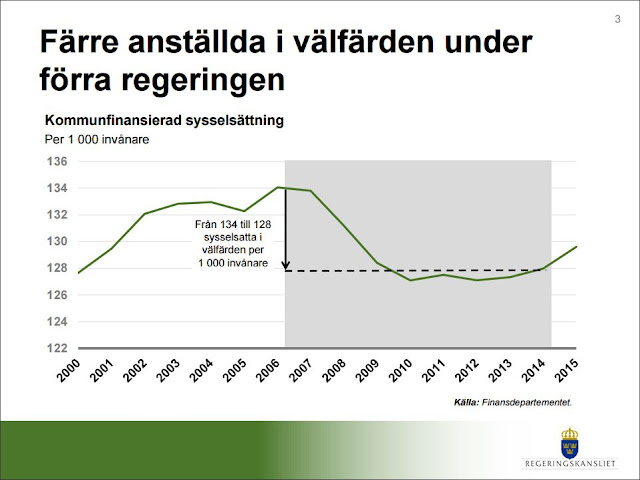 Vi börjar med denna bild. Om vi tittar i SCB:s statistisk över Sveriges befolkning under perioden 2006-2014, dvs. under alliansregeringens tid, så upptäcker vi att Sveriges befolkning ÖKADE med nästan 7% under perioden. Så det är klart att om ökningen till huvudsak består av invandring och nyfödda, så lär inte de vara människor som kommer in i den kommunfinansierade sysselsättningen under ett par mandatperioder. Faktum är att om man korrelerar med befolkningsökningen, så minskade den kommunfinansierade sysselsättningen med mindre än förväntat. Så trots förutsättningarna, så klarade sig alliansregeringen riktigt bra.